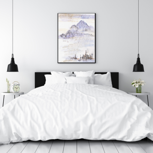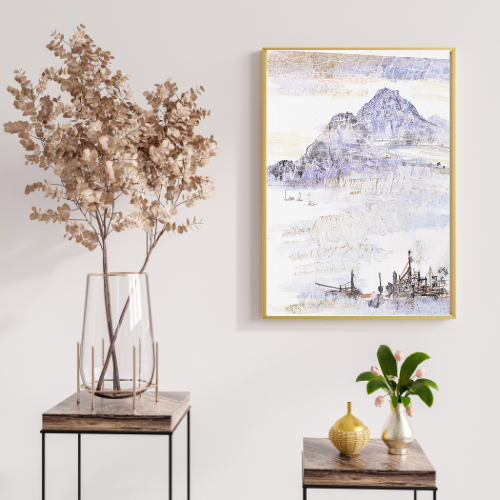 This artwork, created by John, the vast ink maniac utilizes his unique "Breaking Force of Light" technique to transform distant mountains into a dreamy landscape of purple hues. The peaks, like phantoms, are faintly visible, prompting reverie and veiled in a mysterious aura. A gentle lilac sea of clouds envelops the mountain range, partially obscuring its form, adding to its mystique. On the waters, aboard the boats, laden with subtle melancholy, people gaze towards the distant mountains, the emerald vista sparking a desire to draw near. Simultaneously remote yet seemingly within reach, as if some vessels are laden with a delicate wistfulness.
