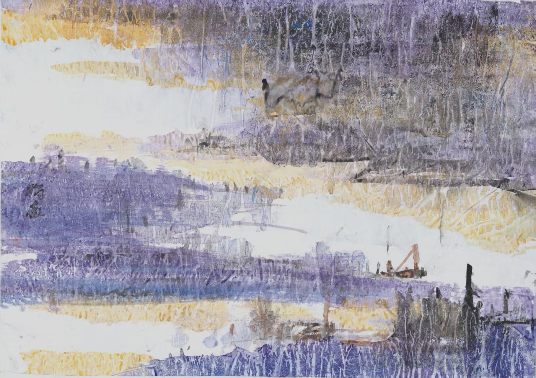這抽象畫作在暮色陽光中閃耀,似未完詩篇,暗示時間與空間之祕。紫色山坡伸展,彷彿大地呼吸凝結永恆,每筆彷自然低語,帶入熟悉陌生世界。遠方紫色夢幻邊界,疊疊色彩像山脈和雲海,黃光透時迷霧希望微光,通向內心靜謐之門。樹影風吹深淺筆觸自然呼吸,展現心靈之美感,啟發創作融入自然韻律,空間靈魂畫卷讓觀者 沈醉於生命之美好。作 品如暮色陽光,溫柔深邃,平凡神秘,藝術不僅為視覺樂趣,更是思想心靈歸宿之所,尋找平靜與自由。
